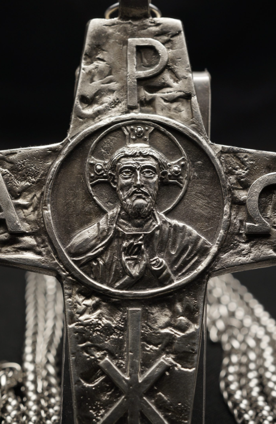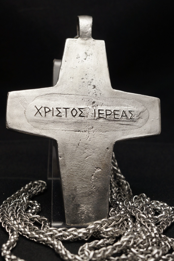 Источник вдохновения: Крест выполнен по утраченной новгородской фреске 12 века, где Господь изображен в виде священника времен Византии. Крест слегка вогнут и изображение находится в небольшом углублении для защиты изображения от повреждений.