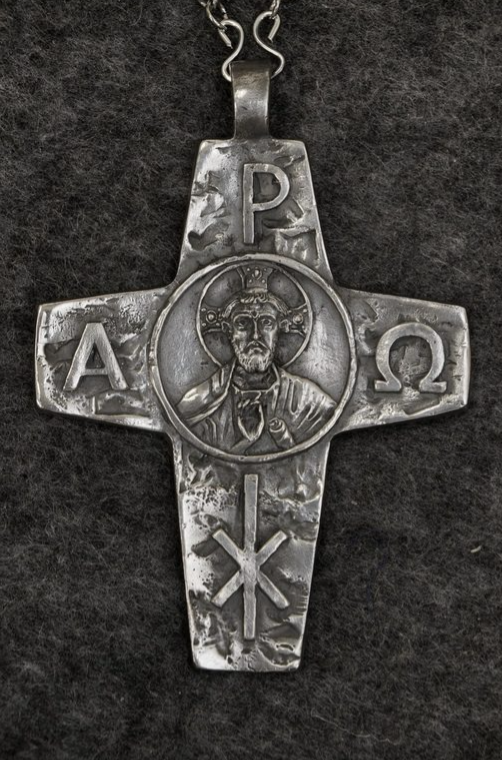 Источник вдохновения: Крест выполнен по утраченной новгородской фреске 12 века, где Господь изображен в виде священника времен Византии. Крест слегка вогнут и изображение находится в небольшом углублении для защиты изображения от повреждений.