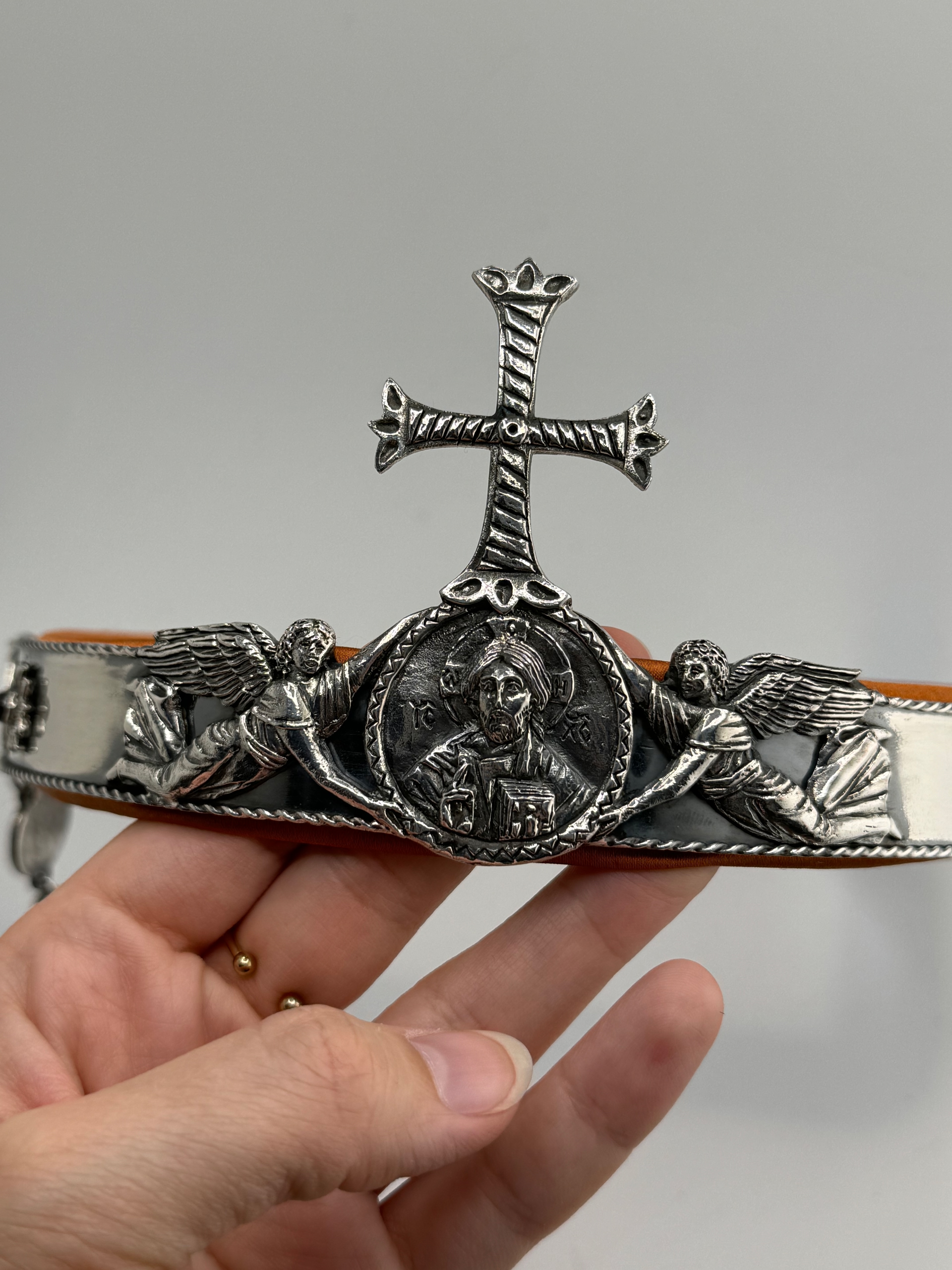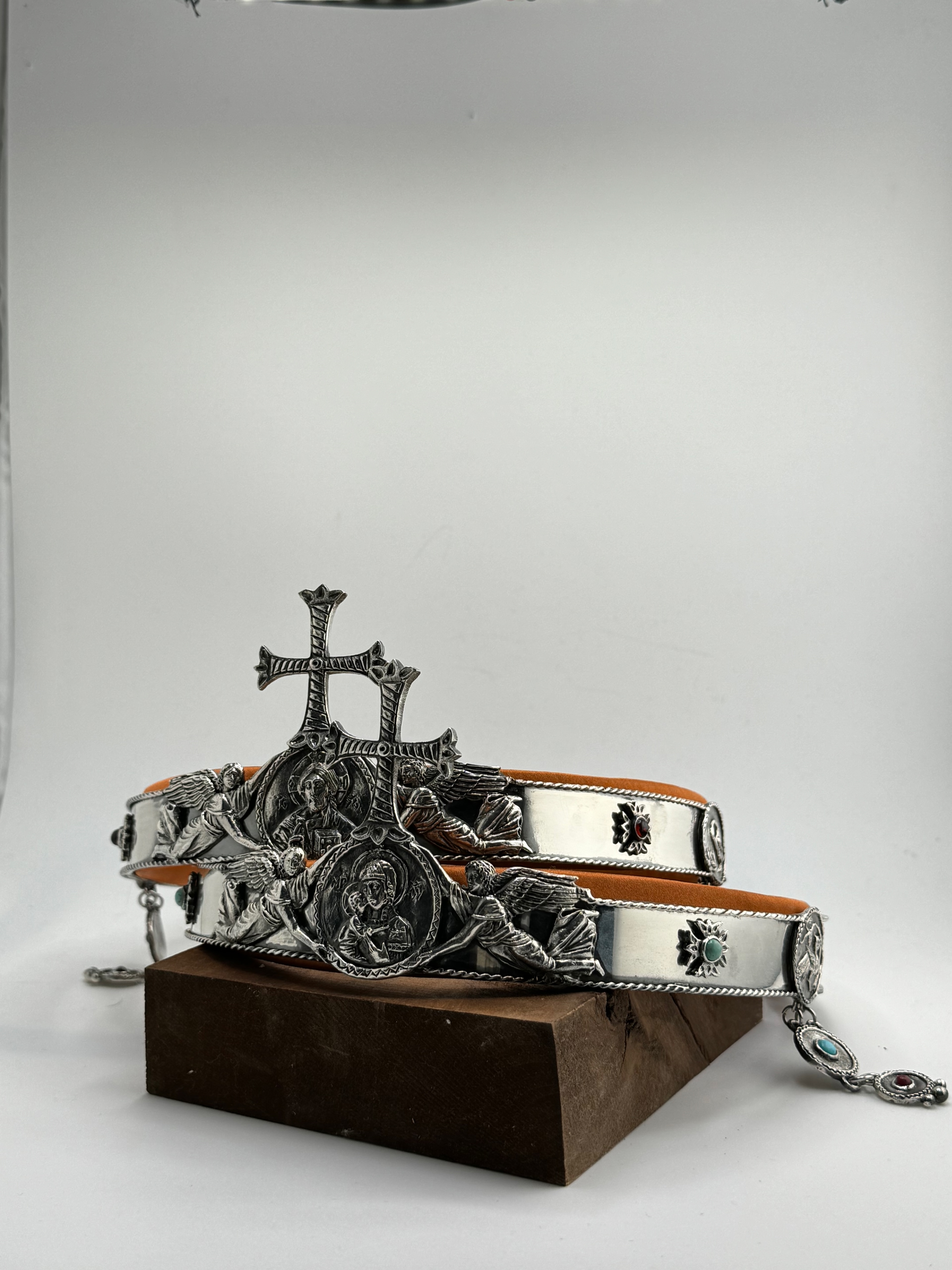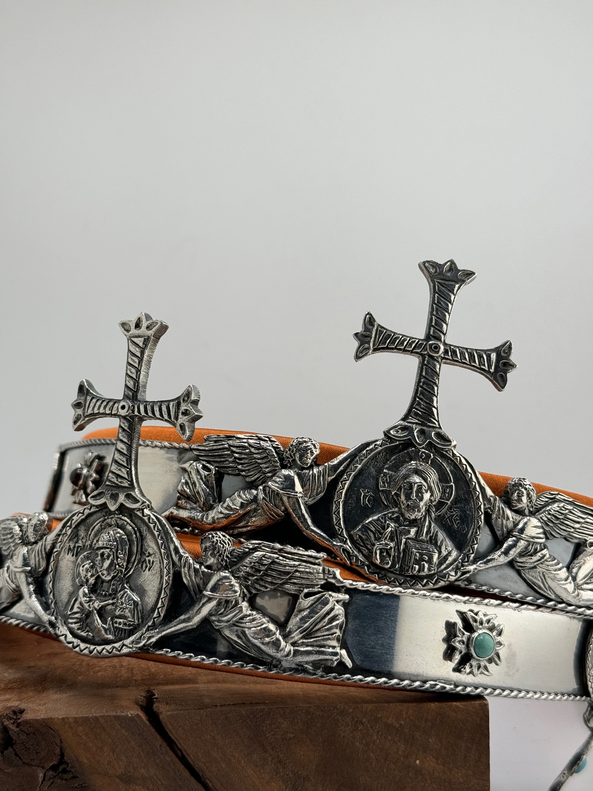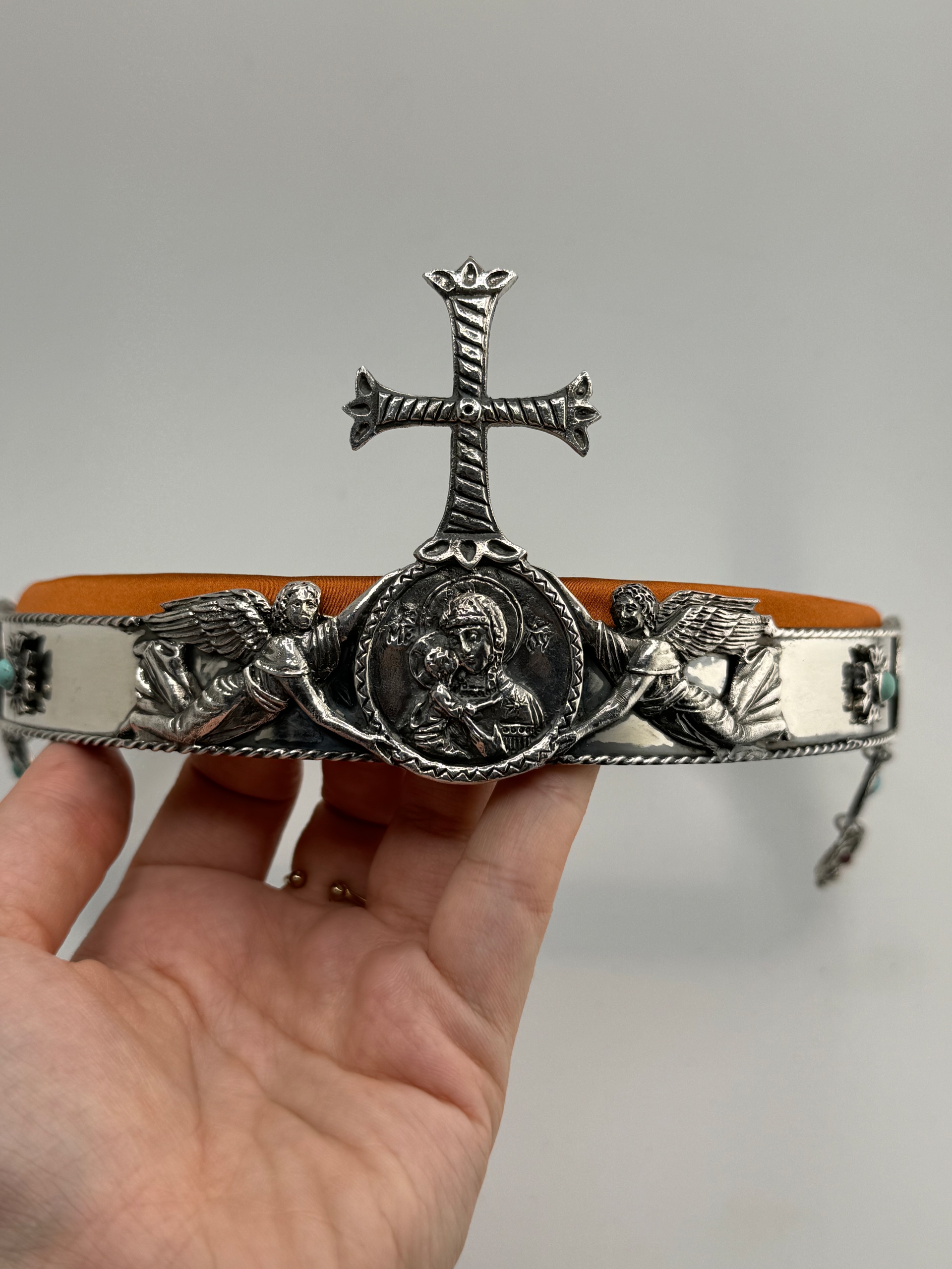 Материалы: медь, оловянное литье, серебрение, украшения натуральными полудрагоценными камнями. Внутри мягкая подкладка, обтянутая натуральным французским шелком.